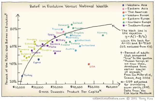 - Belief in Evolution vs. national wealth. Notice that the US is a fringe data point.
