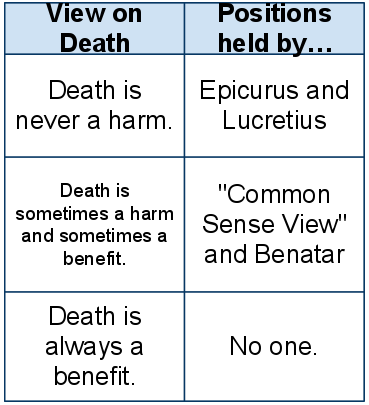 With Epicurus’ argument, Benatar looks at what it means to be deprived of something. Can the dead still be deprived of something? Surely, those who are murdered seems to be deprived of something rather than those who die of natural causes. For the dedicated Epicurean, neither of them are deprived and they have good arguments for doing so. Benatar splits the middle and argues that death is sometimes a harm, and sometimes a benefit, which he calls the “common sense view” of death. Now, we have three pictures of death: