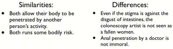 At this point, I could imagine (and I’m sure Nussbaum does too, which is why I think she includes this example) that someone could respond by saying, “but these previous professions have their internal bodily space intact. Thus, these professions are not debased. The prostitute, however, has sex for commercial benefit which is why she has a lowly occupation, and that is why it’s immoral.” The argument can be formed as this: