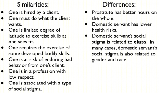 The similarities shows that while if we accept one (domestic servitude), we ought to accept the other. This strategy, however, seems pretty weak. I think that Nussbaum was using this example to counter a common argument against prostitution: prostitution is wrong because it debased oneself by doing a lowly profession. Here’s the argument: