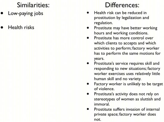 Nussbaum’s strategy is interesting in this example because she focuses on the disanalogies here. However, the disanalogies work in favor of prostitution because the prostitute has better circumstances than the factory worker. Yet, Nussbaum argues that where the factory worker has the advantage, the way to fix this is to legalize prostitution so that the prostitute is not the target of violence and has a lower risk of health.