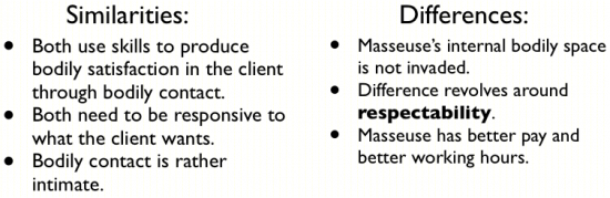 The masseuse is considered not degrading her body nor does she turn her body into a commodity by using her body to give customers pleasure. The point is driven home from Nussbaum: “One is having sex, and the other is not. But what sort of difference is this? Is it a difference we we want to defend? Are our reasons for thinking it so crucial really reasons, or vestiges of moral prejudice?”