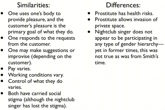 Again, both have many similarities, and we don’t find the nightclub singer doing any immoral activity nor do we find the agent participating in nightclub singing immoral or having a flawed character. I think Nussbaum picked this analogy in order to drive the point home that this was considered a lowly occupation in Smith’s time, but no longer our time. Thus, singing was considered low not based on reasons, but based on prejudice. Likewise, prostitution could be considered low because it could be based on prejudice as well. This analogy is going back to the original argument that I gave toward the beginning of this post.