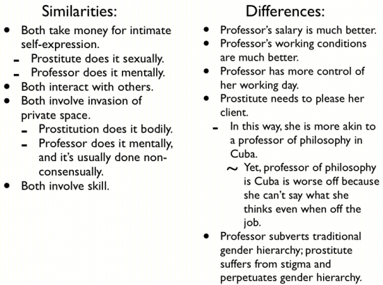 With the disanalogies here, it seems that the occupation of prostitution is at a disadvantage. So why does Nussbaum use this analogy? I think the main point is to compare the prostitute with the professor of philosophy in Cuba. While we don’t think there is anything wrong with the professor of philosophy in Cuba for speaking her mind, those around her do. But the problem is that the professor’s profession is not immoral; she’s in a situation where the structure of society has made it appear as if her occupation has a stigma. In other words, the professor of philosophy in Cuba has a stigma, but this is based on a prejudice, not reason. Albeit this prejudice is structural and institutional rather than obvious, but she is stigmatized from false judgements and emotions. This may have an affinity toward the prostitute. Does the stigma against prostitution have an obvious prejudice, or is it structural? The point is that this stigma is not some a priori truth regarding the professor of philosophy in Cuba. The same is true with the prostitute. The reason why she’s stigmatized is because people view her that way. In other words, the problem with the professor in Cuba is not the professor, but the people perceiving her in a certain way. Likewise, the problem with the prostitute isn’t the prostitute herself, but the people who view her.