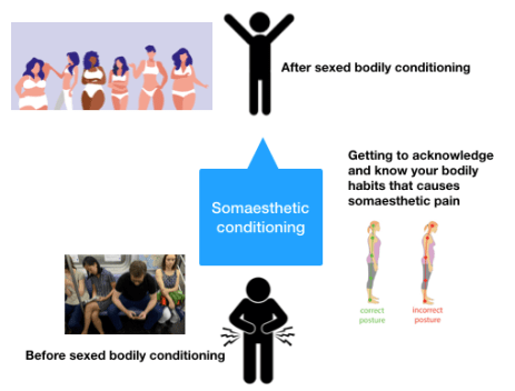 These bodily comportments can consist of certain poses, gait, body language, and appearance. Using somaesthetics as a tool can show us how bodily comportments gives clues as to how men and women endorse various gender stereotypes. “Manspreading” is one example. However, liberation is not simply changing individual or small group’s ideas and bodily disciplines; it can only be done by changing the larger situation that defines what the genders can be, which means that the social, political, and economic conditions must change for true liberation.