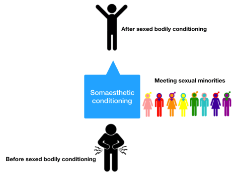 My first example is simply interacting with others who are sexual minorities. People may be repulsed with transgender people, those who are same-sex oriented, or polyamorous people. People can react against them where the result is ostracization, harm, or death of the sexual minority. Even if people, in their mind, have no problem with sexual minorities, people may have a somatic reaction that is harder to control. Their body may react with contempt, disgust, or even some fetishized fascination. I do not have a notion of what sort of somatic corrective there can be. I leave that up to psychosomatic professionals. What I want to propose is simply being aware of what other people’s bodies are doing, which can be really challenging since they may not notice their own bodily reactions. Bodily habits could be ingrained and we consider those bodily movements as normal. It is not until we reach a point where someone points this out to us or we feel uncomfortable with our bodily movement where we recognize a problem. Again, like before, I am not offering any corrective; I want to acknowledge the problem and hope that others will recognize the issue. The corrective can come from psychosomatic therapists which can then inform sex educators.